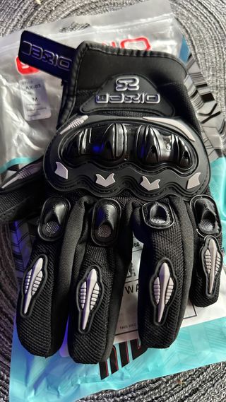 Guantes de moto de estilo deportivo en talla M. Cuentan con protecciones en nudillos y dedos. - Diseño en color negro. - Material textil y protecciones rígidas. - Cierre ajustable en muñeca.