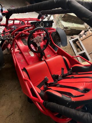 Buggy Sahara de dos plazas en color rojo. Ideal para diversión y aventuras. - Asientos deportivos rojos con cinturones de seguridad. - Chasis tubular resistente. - Ruedas todoterreno. -carbulador nuevo -falta itv Se cambia por quad de 350 en adelante tipo yamaha raptor,suzuki ltz,polaris