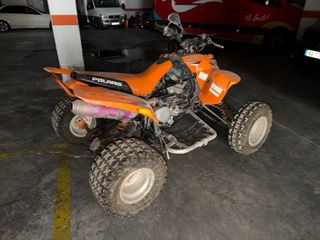 Quad Polaris de color naranja, perfecto para terrenos difíciles. - NECESITA LIMPIEZA CARBURACION Y MANTENIMIENTO, LLEVA PARADO 3 AÑOS. NO SE CAMBIA POR NADA - - TAMBIEN NECESITA ALGUNAS REPAraciones. - Diseño deportivo y robusto. - Ruedas todoterreno para máximo agarre. - Se paro hace 3 años arrancado. - Se le cambio pistón, transmisión trasera y frenos. - Ruedas con poco uso. - No tiene itv.