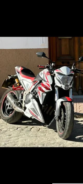 Moto Honda estilo naked en perfecto estado. Ha sido revisada recientemente. moto en perfecto estado cambiado aquí de distribución que arrastre bujias con centralita hecha amortiguador ohlins trasero con regulador y precarga itv recién hecha está perfecta para hacer el kilómetro motor durísimo y potente - Diseño deportivo en rojo y blanco.