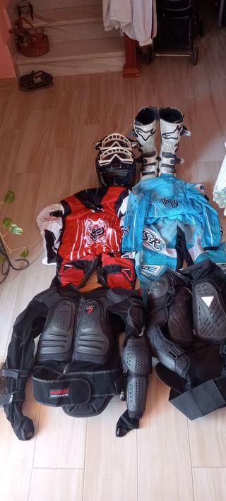 Equipación motocross en buen estado. Incluye una equipación completa: maillot y pantalón Fox Racing rojo y negro, una equipación azul y blanca, casco con máscara, botas motocross y protecciones completas una es XXL otra M y botas 45 (pechera, coderas y rodilleras) algo negociable . No se vende por separado