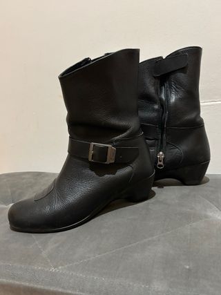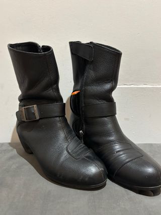 Botas de cuero negro para mujer, ideales para moto,marca ICON ,talla 37 con un poco de tacon prácticamente nuevas. - Cierre con cremallera lateral. - Correa ajustable con hebilla metálica. - Detalle de costuras en la puntera. - Caña media.
