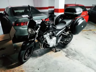 Moto con todo al dia lista para circular. Suzuki Bandit 650 del año 2008 en color negro. Esta moto está equipada con maletas laterales y un baúl trasero para mayor capacidad de carga. Anclaje Givi Monokey. *La moto es mía desde los 7000 kilómetros, puedo responder del mantenimiento recibido y uso de la moto. Actualmente 45.000 kilómetros. *Cadena ultra reforzada recién cambiada. *Todos los manguitos cambiados a Silicona, para toda la vida, solución al mal endemico del modelo. *Se entrega todo el material original junto con la moto. *Manillar, retrovisores he intermitentes homologados y en ficha de ITV. +Motor K8 Inmortal