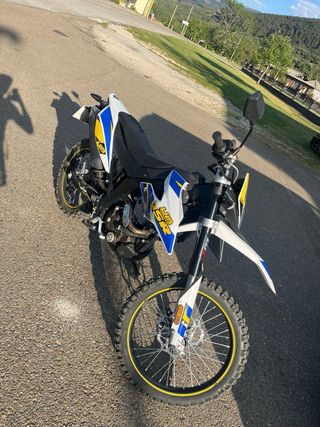Moto de 125cc con un diseño deportivo y moderno. - Color blanco y azul. - Ruedas de supermotard. -Akrapociv -Careta husbarna Tengo tambien careta original, retrovisor,intermitente y aparte hay ruedas de campo que las compre aparte. 23000 2022 SIN ITV DE AHI EL PRECIO