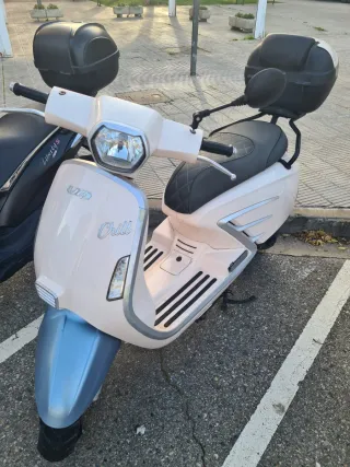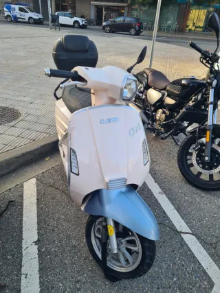 Se vende scooter UM Chill de 49cc. - Color: Rosa pálido y azul. - Diseño moderno y elegante. - Asiento negro con costuras. - Baúl trasero negro. - Ruedas en perfecto estado - 7500km - 2021 - Tiene motor de arranque automatico y manual - Dos caballitos Moto comoda y ligera Se puede conducir ckn carnet B.