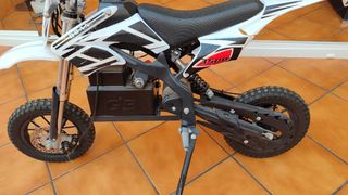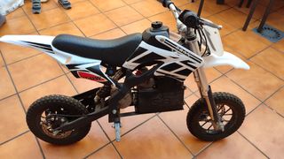 Moto de cross electrica de 350w 2 velocidades,con llave para arrancar,altura 60 cm desde el suelo al asiento, mide 1,05m desde el guardabarros delantero al trasero, neumaticos, cadena, frenos de discos delanteros y traseros todo en buen estado,funciona todo bien,tiene su cargador, pero la bateria le dura 10 min,habria que sustituir la bateria..lleva dos baterias, y pongo una foto con lo que valen las dos baterias nuevas.