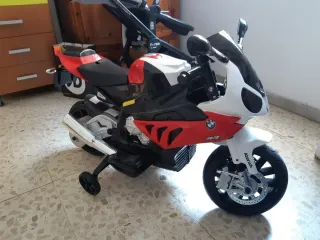 Moto eléctrica infantil con diseño deportivo. - Ruedines de apoyo. - Diseño inspirado en BMW. - Colores rojo, blanco y negro. Funciona perfectamente está nueva mi hijo solo lo uso un par de veces y no lo quiere tengo la factura es de la tienda juguetilandia me costó 220 tiene garantía