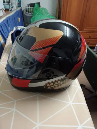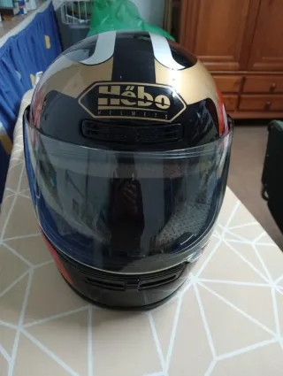 Casco integral para moto con un diseño llamativo en negro, dorado y rojo.Gran seguridad.(No es un quita multas) Es una talla media/pequeña(mujer u hombre de cabeza pequeña).Nuevos.Con funda.marca HËBO - Diseño con detalles gráficos. - Visera transparente.
