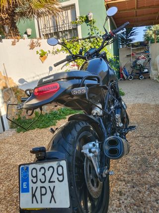 Moto Benelli Leoncino 500 en color negro. 11.400 km. Impecable, salvo un roce que le hice con un bordillo de 1 cm (ver foto) en un bajo. Siempre bajo techo. ABS desconectable. Porta movil y USB. Se regala cadena Aubray, candado Xtrem, alforjas Shad e 48, porta alforjas, casco caberg, guantes rainers y 2 chaquetas Dainese y By city con protecciones (cremalleras dan fallos). Ya no la uso nada. 50 km último año. Revisiones en casa oficial. Está como nueva.