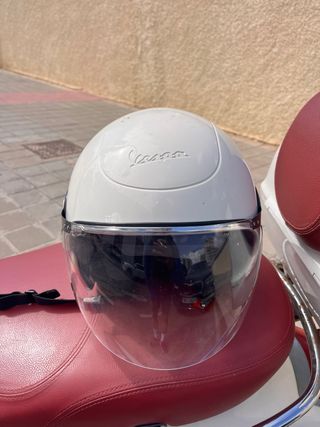 Casco blanco original de la marca Vespa, con un diseño moderno y elegante. Perfecto para tus desplazamientos. Talla S - Logo Vespa grabado en la parte superior. - Visera transparente y visor solar integrado en el casco que se recoge hacia arriba. - IMPORTANTE: necesita reparación o sustitución de almohadillla interior ya que no se encuentra en buen estado