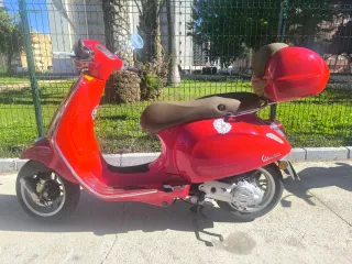 Scooter Vespa en color rojo, con asiento marrón y maletero. - Transmisión automática. - Diseño clásico. - Incluye maletero trasero. - Del 2018