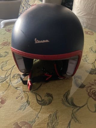 Casco de estilo scooter con detalles en rojo. - Logo de Vespa. - Ribete rojo. - Correa ajustable.