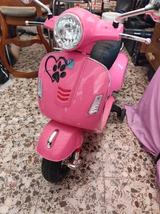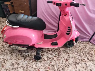 Moto eléctrica estilo Vespa para los más pequeños. Ideal para aprender a montar y divertirse. - Ruedines de apoyo para mayor estabilidad. - Diseño inspirado en la icónica Vespa. - Asiento cómodo para el conductor. -buen estado , (5 vecs usado )