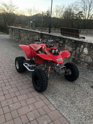 Quad Honda Trx450R en color negro. Diseñado para un rendimiento deportivo. - Diseño agresivo y deportivo. - Neumáticos todoterreno. - Suspensión delantera roja. Con papeles. Nunca Circuito, solo salidas para ir almorzar. Pastillas nuevas y revision hecha. Tambien doy el silencioso trasero original y el faro delantero para pasar Itv. No me interesa hacer ningun cambio. Abstenerse ofertas absurdas