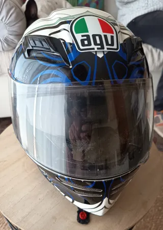 Casco de moto deportivo con un diseño llamativo. - Diseño con detalles en azul y blanco. - Visera transparente. - Logo de AGV en la parte superior.