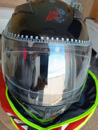 Casco de moto en talla M, con un diseño llamativo en negro y amarillo, en buen estado. - Diseño en negro con cuadros y detalles en amarillo. - Visera transparente.