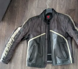 Chaqueta de cuero Dainese para motociclistas, con un diseño deportivo. Ya era estilo vintage en 2008 así que no pasa de moda nunca. En buen estado de uso, en salidas domingueras, no al día a día, encerada de vez en cuando. No tiene desgaste visible y el interior con el forro de invierno extraíble con cremallera está en perfecto estado. Chaqueta de 399€ en su día. Ya me queda pequeña y aunque me gustaría conservarla dudo que vuelva a caberme. Que le disfrute alguien más delgado! -