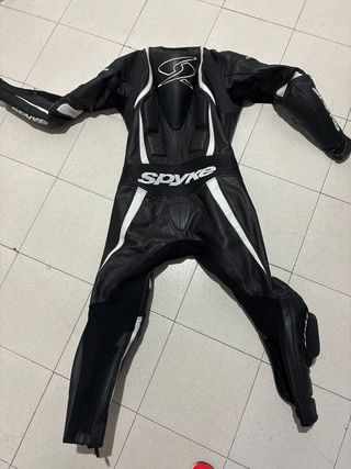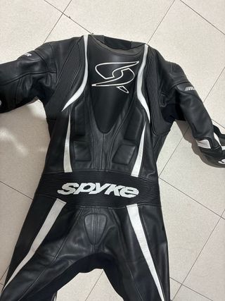 Mono de cuero Spyke para moto deportiva. - Diseño en negro con detalles blancos. - Cremalleras en las mangas y piernas. - Utilizado en 10 ocasiones, lo vendo por cambio de moto a trail.