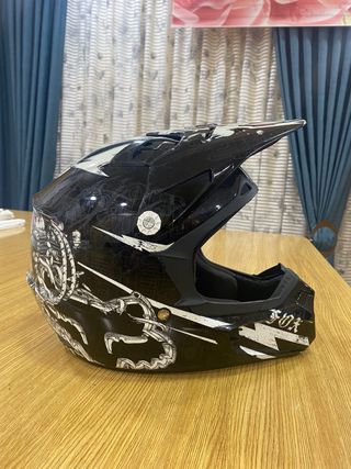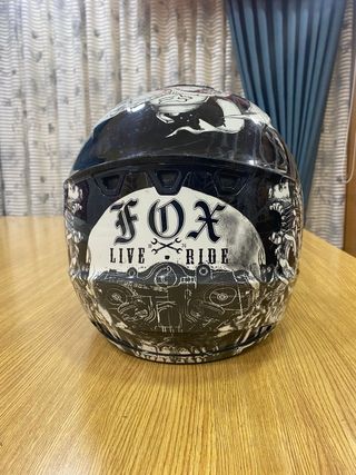 Casco de moto marca FOX con un diseño llamativo en negro. - Diseño gráfico detallado. - Visera aerodinámica. - Cierre de seguridad.