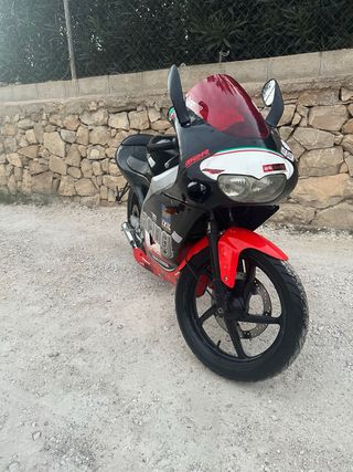 Moto deportiva Aprilia con un diseño llamativo en negro, rojo y blanco. Pocos kilómetros , tiene solo 3 años Batería nueva 125c La moto esta bien pero le falta itv yo no la he usado la tengo por otro motivo L voy a bajar de precio por qué quiero quitarmela de encima= - Guardabarros delantero con detalles gráficos. - Asiento bicolor. - Manillar con protecciones.