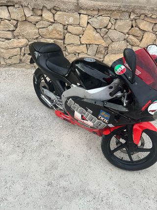 Aprilia rs 50 Se vende o cambia Tal y como se ve en las fotos Itv hasta septiembre de 2027 Top negro Carburador OKO 28mm Caja de laminas malosi Cigüeñal reforzado Escape jazen Bujia y pipeta nuevas Ruedas nuevas Se entrega con otro carenado y otro asiento del piloto Se puede ver sin compromiso