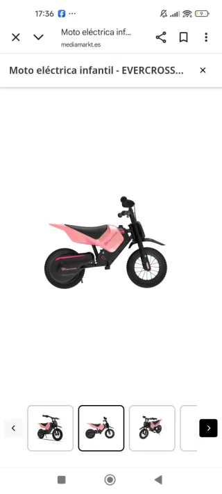 Moto eléctrica infantil de color rosa y negro. - Diseño tipo cross. - Ruedas negras.