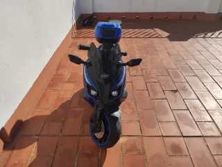 Moto eléctrica para niños, ideal para que los más pequeños disfruten. - Diseño deportivo en color azul y negro. - Ruedas con detalles en azul. - Incluye maletero superior.