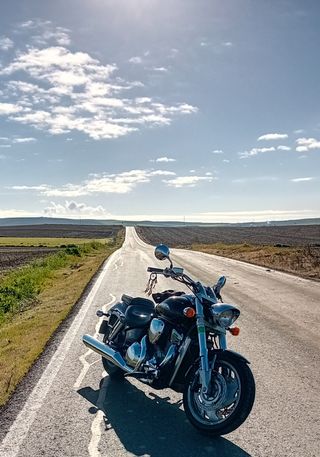 Moto Hyosung Aguila en color negro. Diseño clásico y cómodo. - Asiento doble. - Maletas laterales de cuero. - Respaldo para el pasajero. Precio algo negociable.