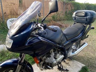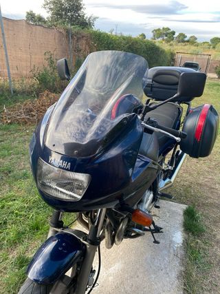 Moto clásica azul oscuro que va de maravilla, ideal para viajes. Se encuentra en perfecto estado, funcionando perfectamente y con la ITV recién pasada. Viene con tres maletas y el neumático trasero recién cambiado, el delantero seminuevo y a medio uso. El único defecto que tiene es un pequeño bollo en el depósito. Tiene 129.000 km. Se admiten ofertas