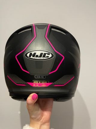 Casco de moto HJC con diseño moderno en negro y detalles en rosa. - Diseño HJC. - Acabado brillante. - Visera transparente. Caja nueva y soportes nuevos. Cristal del casco con ralladuras. Plastico del casco nuevo disponible tambien :)