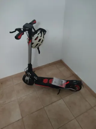 Patinete eléctrico Aprilia eSR1 con un diseño deportivo en negro y detalles rojos. Incluye casco. - Manillar con puños ergonómicos. - Plataforma antideslizante. - Ruedas de 10 pulgadas. - Freno trasero electrónico. - Luz LED delantera y trasera. Batería estropeada.