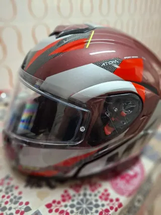 Casco de moto en talla L con un diseño deportivo. - Color principal granate con detalles en rojo y gris. - Visera transparente. - Serie Sport.