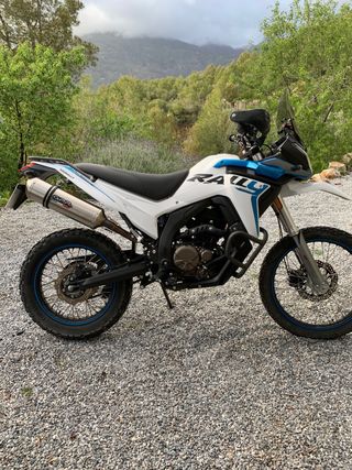 Moto Voge 300 Rally en color azul. Se entrega totalmente revisada y lista para usar. - Escape Ixil y el original sin uso - Ruedas de tacos y se entregan las originales. Cámaras ambas ruedas nuevas. - Luces extra para rutas nocturnas. - Espejos retrovisores enduro, puños de espuma. - Revisión recién pasada. Se ha cambiado el aceite y filtro siempre cada 2500km y limpiado el filtro de aire. - Powerflow instalado con filtro de aire de alto rendimiento. - Powerflow desconectable - OBD con conexión a movil - soporte movil para navegación - muy bien cuidada - 7500km - Se entrega todo lo original. - NUNCA HA DADO NINGUN FALLO.