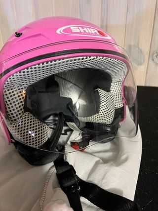 Casco semiabierto de color rosa. - Visera transparente. - Interior con rejilla.