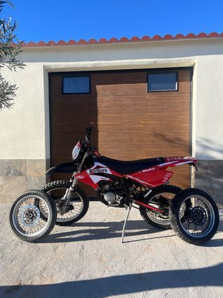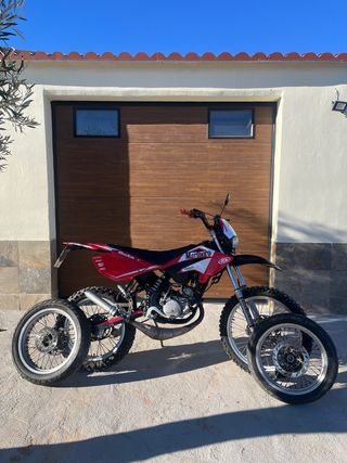 Beta RRT Enduro/SM Totalmente revisada y funcionando perfectamente. Cilindro 49 original y carburador 12 dellorto ITV hasta 06/02/2028 Se entrega con los dos juegos de llantas. (Enduro/Supermotard) Neumático trasero de tacos, pastillas de freno delanteras, todos los líquidos , velocímetro, kit estética y funda de asiento, maneta freno delantero, acelerador domino y estriberas traseras nuevas. Escape totalmente restaurado, lacado y fibras nuevas. (Homologado y con papeles originales de homologación) Equipa doble radiador (originalmente estas motos solo montan uno) Palabras clave: Beta rrt art ark rieju mrt smx derbi senda