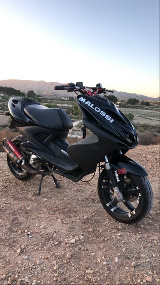 Scooter Yamaha Aerox de 49cc y 2 tiempos. Un modelo icónico y deportivo. - Diseño agresivo y juvenil. - Manillar deportivo. - Ruedas de aleación. Lleva un 70 top negro Carburador de 21 pwk Trasmision malosi Refrigerada por agua Itv has finales de 2026