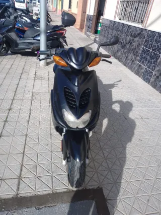 Scooter Yamaha Aerox del año 2004 con 28.000 kilómetros. - Motor de 50cc. - Refrigerado por agua, radiador nuevo. - Freno de disco delantero y trasero. - Neumáticos en buen estado michelin Citygrip 2 - Variador y embrague malossi. - Tubo de escape Yasuni R - Pastillas delanteras y traseras nuevas La moto se entrega con la itv al dia
