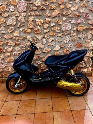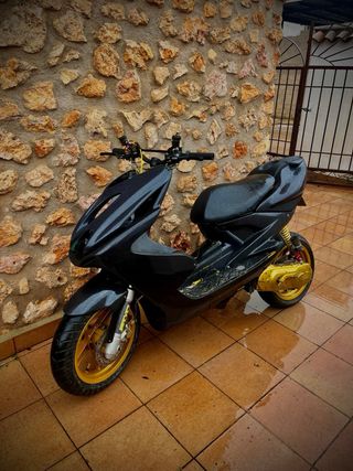 Yamaha Aerox de color negro con detalles dorados. Un scooter deportivo y ágil. -motor preparado: -74 airsal aluminio -cigüeñal carenzi cerrado -variador carenzi -yasuni R -rotor itkalkit selectra -carburador 21 voca -correa polini -laminas de carbono 8 petalos carenzi -Tiene itv hasta mayo,el motor aun esta en rodaje ,solo cambio por 125 2 o 250 2t,no se vende solo cambio por otras motos!!!