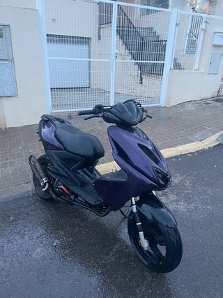 Scooter Yamaha Aerox del año 2004 con 28.000 kilómetros. - Motor de 50cc. - Refrigerado por agua, radiador nuevo. - Freno de disco delantero y trasero. - Neumáticos en buen estado michelin Citygrip 2 - Variador y embrague malossi. - Tubo de escape Yasuni R - Pastillas delanteras y traseras nuevas La moto se entrega a falta de pasar la itv