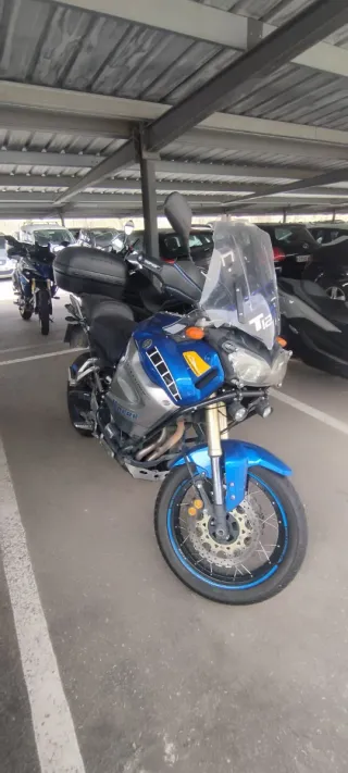 Moto Yamaha Super Ténéré 1200 en color azul. Muy robusta, me acabo de hacer la revisión completa con todos los cambios necesarios. Todo está perfecto para su uso sin ningún problema. Dispone de los tres maletines originales Yamaha, puños calefactables antinieblas y el sillín de viscoelástica, pantalla puesta y una más alta quitada, muchos extras. Es el año 2010, tiene unos 70.000 km. Nunca ha tenido ningún accidente ni avería importante. Siempre ha dormido en garaje y ha pasado todas las revisiones en la casa. Vendo aparte el maletín gibi metálico de 52 litros que caben dos cascos y la parrilla para adaptarlo a la moto. No cambio