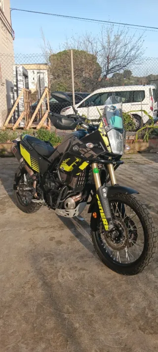 Moto Yamaha Ténéré 700 con un diseño deportivo y llamativo Finales 2021 con más de mil euros en extras esnorque cambiado por más caudal repogramacion hecha casi 700eur ecape s.c projec y catalizador anulado se entrega el original completo porta maletas y alforjas solo cambiaría por tmax a partir del 2018 en adelante ajustando diferencia a favor o en contra. Cambio solo tmax honda forza 750 - Decoración personalizada con detalles en amarillo y azul. - Parabrisas alto para mayor protección. - Protectores de motor y puños. - Neumáticos mixtos para todo tipo de terrenos.