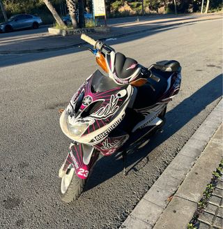 Yamaha Jog RR en color morado. Un scooter deportivo y ágil. ITV 2026 finales de octubre top negro 70cc con menos de 2 meses de uso 17'5 dellorto bomba de agua nueva y tapa de agua nueva , variador malossi ,embrague stage6 con 3 4 meses de uso, tapas nuevas, doy cilindro de serie tubo de serie , un 74cc top rosa culata culatín , alguna tapa que otra varios carburadores etc..... - Diseño deportivo. - Color morado llamativo.