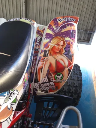 Quad Yamaha Raptor 660R con un diseño personalizado y llamativo. - Diseño gráfico único. - Manillar Renthal. - Espejo rojo. - Neumáticos todoterreno. - se acepta cambio por enduro o algo de mi interés