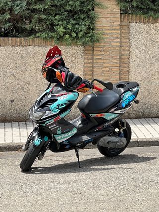La moto tiene 22k km pero el motor está cambiado a uno de aerox ( el de la foto ) doy TMB el de casa Tiene la ITV hasta 2027 mayo Única pega son las pastas q la h está un lado roto y un picotazo atrás Va con : top rosa culatin/ 21 voca/ escape blaze 70/80/ transmisión entera polini/ cigueñal brk competición lleva también el radiador nuevo como se ve en la foto con un mes y la bomba de agua eléctrica Doy TODO lo de casa su guardabarros todo También puedo dar más piezas que qiera el comprador sumando precio Poco negociable no m urge la venta