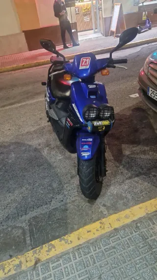 En venta ciclomotor Scooter Yamaha Aerox de 49cc en color naranja y negro en muy buen estado, motor nunca trucado, totalmente original, le funciona todo arranque a boton, intermitentes, luces, etc, ITV pasada hasta finales de 2026, se puede vender en la península ya que es matriculada allí, asiento recien tapizado, asiento de copiloto nuevo, bomba de agua, y anticongelante nuevo,rodillos nuevos, guias de variador nuevas, ideal para moverse por la ciudad con agilidad, algo negociable yamaha jog r rr, big jog, neos, aerox, aprilia sonic, piaggio zip aire, agua, base, sp kat, typhoon, ktm