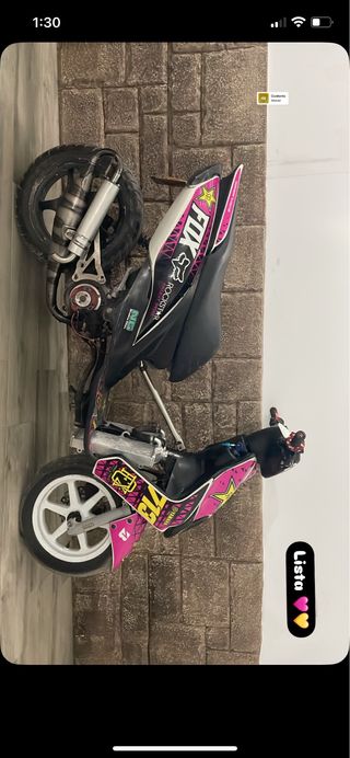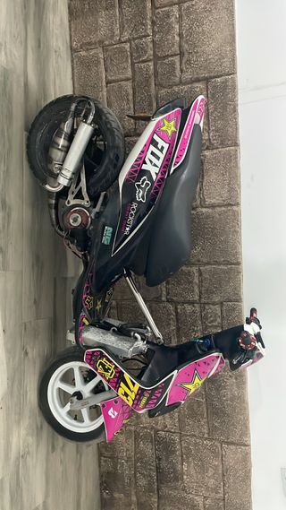 Aerox del 2003 preparada al gusto. Montado en motos ibañez Cilindro top rosa 74 8T. abierto y transfers y culata tocados , Cigueñal malossi reforzado biela de titanio. Escape yasuni carrera 21 Poleas sobredimensionadas malossi Variador sobredimensionado furia rosa3.2g Correa polini la gorda Embrague malossi mhr muelles rojos Láminas vforze3 Carburador 28 pwk powerjet filtro stage6 Rotor mvt con luz Bomba eléctrica malossi Tapadera del carter echa con agujeros bien echo para que refrigere y no se caliente y los muelles duren mas tiempo Cableado nuevo entero puesto con el motor La moto está hecha al detalle