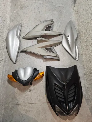 Pieza de carenado frontal para Yamaha Aerox. - Color negro brillante y gris - Incluye: Laterales Frontal Tapa delantera Piezas traseras Intermitentes delanteros Cúpula/faro delantero (negro) Estado: Usados, con algunas marcas y roces normales del uso (ver fotos). No están rajados estructuralmente. Ideales para restauración, proyecto o recambio.