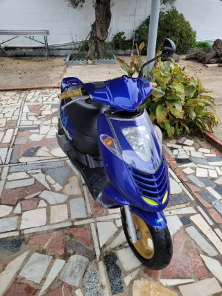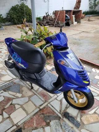 Moto tipo scooter Yamaha aprilia sony de 50cc en color azul esta como viene de casa siempre metida en un garaje tiene 7600 km , prácticamente nueva se pone a 85 k h - Diseño deportivo y juvenil. - Manillar con puños de color amarillo. - Ruedas doradas.