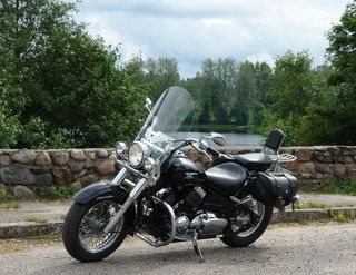Moto Yamaha V-Star 1100 Custom en color negro. Ideal para disfrutar de la carretera. - Maletas laterales de cuero. - Respaldo para el pasajero. - Parabrisas. - Doble escape cromado. Año 2004 15000km ruedas nuevas y todos los mantenimientos hechos