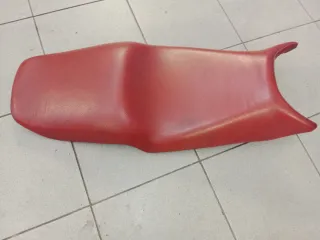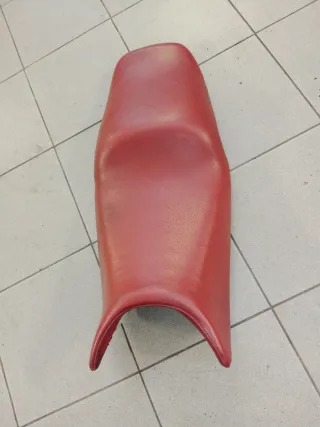 Asiento de moto de color rojo. Su diseño ergonómico ofrece comodidad. - Material resistente. - Forma contorneada.